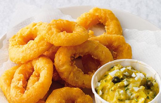 Tintenfisch mit Kaperndip Zutaten 2 hart gekochte Eier 4 EL Olivenöl 2 Essiggurken (ca. 50 g) 1 Frühlingszwiebel 1 EL Rotweinessig 1 TL Dijonsenf 1 EL kleine Kapern 2 EL TK-Petersilie Salz Pfeffer Zucker 4 EL Öl 250 g Tintenfischringe in Backteig (Fertigprodukt) [...]