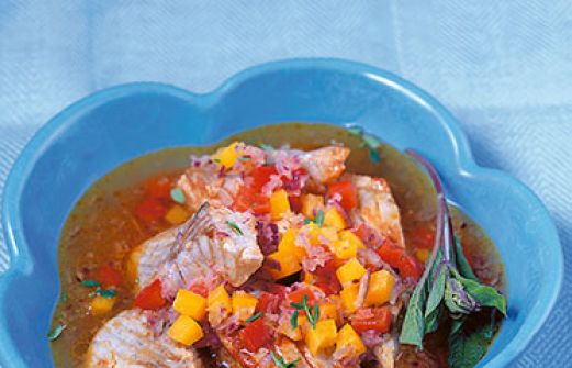 Paprika-Seelachs-Suppe Zutaten 200 g Seelachsfilet 1 EL Zitronensaft 1 rote Zwiebel je 1 rote und gelbe Paprikaschote (400 g) 2 EL Olivenöl 1/2 TL getrocknete Kräuter der Provence 700 ml Gemüsebrühe Salz Pfeffer edelsüßes Paprikapulver 1 TL Tomatenmark 200 g Seel [...]