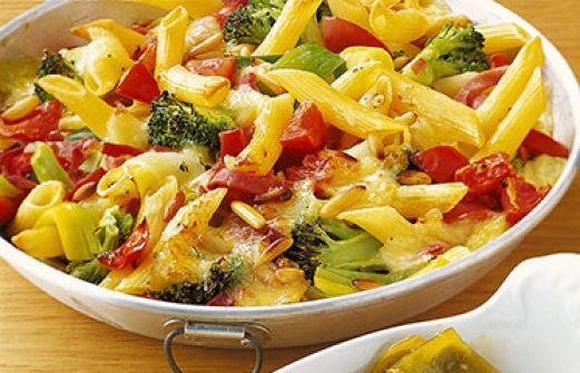 Nudelgratin mit Brokkoli Zutaten 300 g Penne oder Fusilli Salz 500 g Brokkoli 1 Stange Lauch 2 Knoblauchzehen 100 g roh geräucherter Schinken 400 g Tomaten 250 g Mozzarella Pfeffer 2 EL Pinienkerne 1 EL Butter 300 g Penne oder Fusilli , Salz , 500 g [...]
