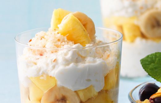 Kokos-Ananas-Milchreis Zutaten 250 ml Milch 250 ml ungesüßte Kokosmilch (Dose) 1 EL Bourbon-Vanillezucker 125 g Minuten-Milchreis 2 EL Kokosraspel ½ kleine Ananas (500 g) 1 große Banane 500 g Magerquark 2 EL Zucker 250 ml Milch , 250 ml ungesüßte Kokosmilch (Do [...]