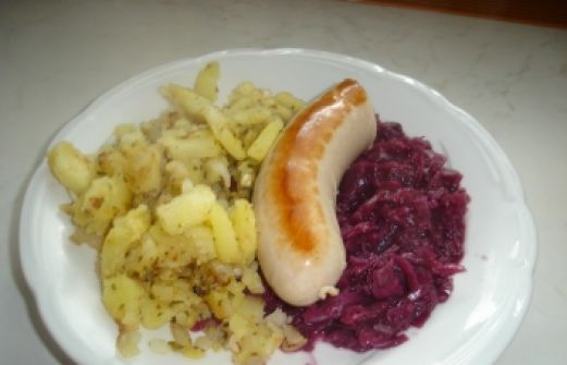 Zutaten für Personen Rezept mit Bild: Bratwurst mit Kartoffelschmarren und Blaukraut Bild einstellen 4 Stück Augsburger oder Bratwürste 0.75 Kilogramm Rotkraut 40 Gramm Fett 20 Gramm Zucker 0.5 Stück Zwi [...]