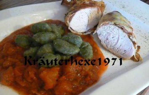 Zutaten für Personen Rezept mit Bild: überbackenes Putenfilet im Speckmantel Bild einstellen 2 Putenfilet 1 P Frühstücksspeck 1 Mozzarella 1 P Spinatgnocchi 1 Dose gehackte Tomaten 1 EL scharfes Tom [...]