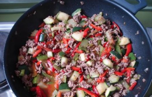 Zutaten für Personen Bild einstellen 2 mittelgrosse Zucchini 500 gr. Hackfleisch gemischt 1 mittelgrosse Zwiebel 250 gr. Paprikaschote frisch oder TK 2 Stück Tomaten 125 ml Gemüsebrühe 2 EL Tomatenmark Salz P [...]