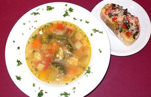 Zutaten für Personen Bild einstellen Bruschetta Olivenöl Pesto Weißbrot Basilikum 5 Tomaten Mozzarella Gouda Parmesankäse Oliven Mengenangaben je nach Bedarf Minestrone: 1 Zwiebel, klein g [...]