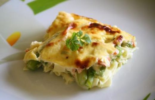 Zutaten für Personen Rezept mit Bild: Auflauf: Käse-Nudel-Auflauf mit Lachs und Spargel Bild einstellen 500 g Spargel grün 2 TL Salz 250 g Bandnudeln 200 g Räucherlachs 150 g Gouda 4 Eier 150 g Qu [...]