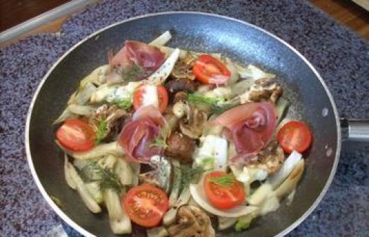 Zutaten für Personen Bild einstellen 2 große Fenchelknollen - mit Grün 4 Cherrytomaten 100 g Champignons braun 4 El Parmesan gehobelt 60 g Parmaschinkenscheiben 1 El Olivenöl 2 El Weißwein halbtrocken bunter Pfeff [...]