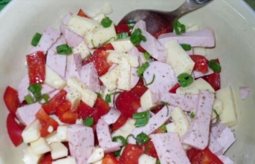Zutaten für Personen Bild einstellen 200 gr. Geflügelfleischwurst 100 gr. Gouda 1 rote Paprika Öl Pfeffer und Salz Lauchzwiebelringe Rezept Zubereitung Käse-Wurst-Salat Wurst und Käse in Stäbchen, [...]