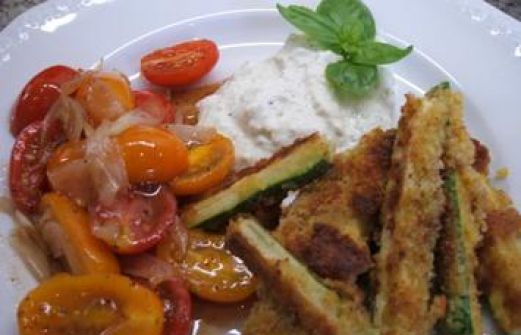 Zutaten für Personen Rezept mit Bild: Gemüse: Panierte Zucchinisticks mit warmem Tomatensalat Bild einstellen die Zucchinisticks 4 Stück Zucchini, frisch und ziemlich klein 1 Stück Ei vom Hühnerhof 1 Me [...]