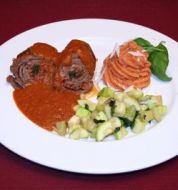 Zutaten für Personen Bild einstellen 2 längliche Auberginen ca. 500 g Salz 1 EL Kapern 1 EL Rosinen 2 EL Pinienkerne 2 Knoblauchzehe 2 Sardellenfilets in Öl 1 Bd Petersilie 4 Zweige Oregano 800 g Tomaten 80 g Sem [...]