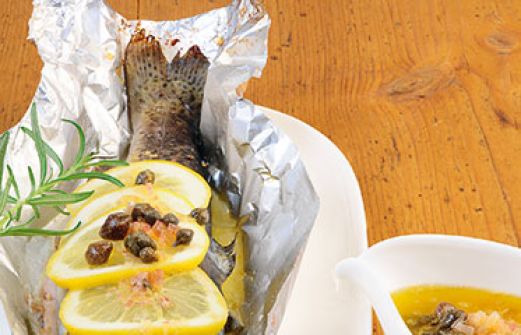 Folien-Forelle mit Kapernbutter Zutaten 2 küchenfertige ganze Forellen (à ca. 350 g, frisch oder tiefgekühlt und aufgetaut) Salz Pfeffer je 2 Zweige Thymian und Rosmarin 2 Bio-Zitronen 2 Knoblauchzehen 1 TL + 80 g weiche Butter 2 Schalotten 1 EL Öl 40 g Kapern 1/2-1 TL H [...]