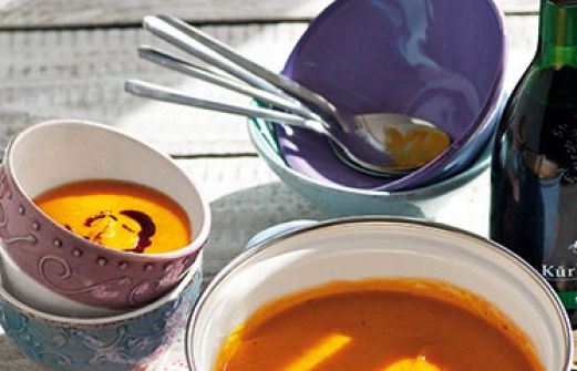 Kürbiscremesuppe Zutaten 1 kleiner Hokkaido-Kürbis (ca. 1 kg) 1 Zwiebel 2 säuerliche Äpfel (z. B. Braeburn oder Boskop) 3/4 l Gemüsebrühe (Instant) 2 EL Öl Salz, frisch gemahlener Pfeff er frisch geriebene Muskatnuss 1-2 EL Zitronensaft 4 EL Kürbiskernöl (nach Belieben) [...]