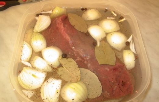 Zutaten für Personen Rezept mit Bild: Sauerbraten Bild einstellen 500 gr Rinderbraten 600 ml Wasser 600 ml Essig 10 Nelken 8 Lorbeerblätter 20 Pimentkörner 20 Pfefferkörner 3 Zwiebeln Sau [...]