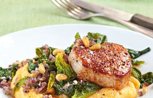 Medaillons im Spinatbett Zutaten 4 Schweinemedaillons (je ca. 60 g) Salz Pfeffer 2 rote Zwiebeln 2 Knoblauchzehen 1 EL Olivenöl 2 EL Pinienkerne 300 g TK-Blattspinat 120 g Instant-Polenta 172 l Gemüsebrühe 4 Schweinemedaillons (je ca. 60 g) , Salz , Pfe [...]