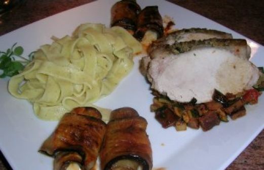 Zutaten für Personen Rezept mit Bild: Schweinebraten nach Lorenza de Medici mit Zitronennudeln und Auberginenröllchen Bild einstellen 1 ½ kg Schweinrücken mit Schwarte 2 Stück Rosamrinzweige 1 Stück Kno [...]