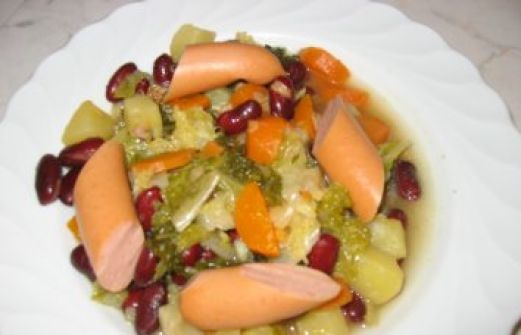 Zutaten für Personen Bild einstellen 600 g Wirsing 5 Kartoffeln 2 Möhren 1 Zwiebel 1 Dose Kidney-Bohnen 2 EL Olivenöl 0.5 l Brühe 4 Schinkenwurste Salz Pfeffer Rezept Zubereitung Bunter W [...]
