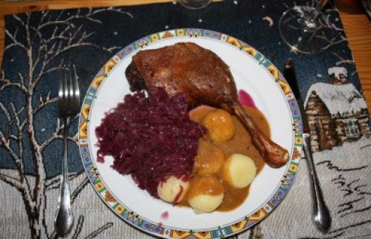 Zutaten für Personen Bild einstellen 4 Entenkeulen 3 Zwiebeln 2 Möhren 2 Lobeerblätter Salz Pfeffer aus der Mühle 1 EL Butterschmalz 1 Glas Rotkohl 200 ml stückiges Apfelkompott 1 EL Speisestärke 2 Sti [...]