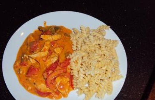 Zutaten für Personen Bild einstellen 500 gr. Hähnchenbrustfilet 2 Stück Zwiebel 4 Stück Paprika rot 1 Teelöffel Öl 3 Esslöffel Ajvar 400 ml Gemüsebrühe 4 Teelöffel Speisestärke 200 gr. Saure Sahne 10 % Fett Sa [...]