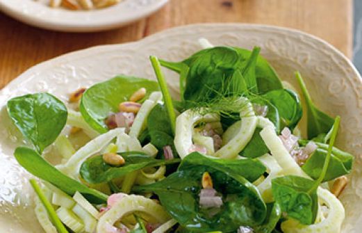 Fenchelsalat mit Spinat Zutaten 2 Knollen Fenchel 150 g junger Blattspinat 2 EL Pinienkerne (ersatzweise Mandelstifte) 2 Schalotten 1 EL flüssiger Honig 2 EL Apfelessig 3 EL Rapsöl Salz Pfeffer 2 Knollen Fenchel , 150 g junger Blattspinat , 2 EL Pinienkerne [...]