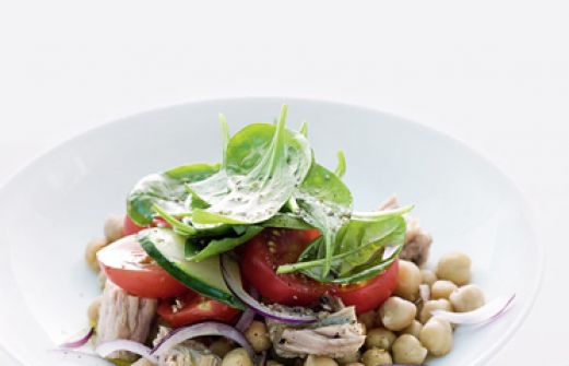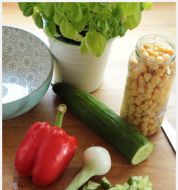 Kichererbsensalat mit Thunfisch Zutaten 2 Knoblauchzehen 1 TL Sambal oelek 2 EL Aceto balsamico bianco 5 EL Olivenöl 1 Dose Kichererbsen (260 g Abtropfgewicht) 2 Dosen Thunfisch im eigenen Saft (à 125 g Abtropfgewicht) 12 Kirschtomaten 1 Salatgurke 1 rote Zwiebel 50 g junger [...]