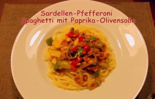 Zutaten für Personen Rezept mit Bild: Feurige Sardellen-Pfefferoni Spaghetti mit Paprika-Olivensoße Bild einstellen für Spaghetti 250 gr. Spaghetti 1 EL Salz für Paprika-Olivensoße 40 gr. Speck [...]