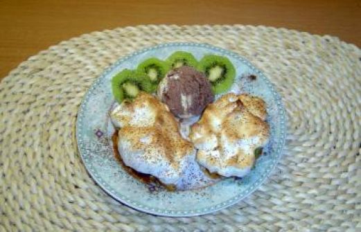 Zutaten für Personen Bild einstellen 300 g Obst nach Wahl 1 EL Mandellikör 1 St Eiweiß 1 EL Puderzucker 1 EL gemahlene Mandeln 1 Prise Salz Zitronensaft, Kakaopulver 4 St Butterwaffeln 2 Kugeln Eis nach Wahl [...]