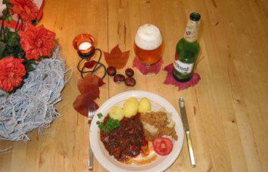 Zutaten für Personen Rezept mit Bild: Hauptgericht - Pilzgulasch Bild einstellen 750 gr. Rindergulasch 150 gr. Pfifferlinge 3 Stück Kräutersaitlinge oder Steinpilze 1 Stück Gemüsezwiebel 1 Stück rote Pap [...]