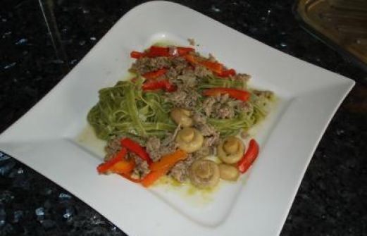 Zutaten für Personen Bild einstellen 100 g Salatgurke 100 g rote Paprikaschote 50 g Champignons 0.5 Stk. Zwiebel 1 TL Öl 50 g Beefsteak-Hackfleisch 50 ml Gemüsebrühe Salz, Pfeffer 50 g Bandnudeln 30 ml Mag [...]