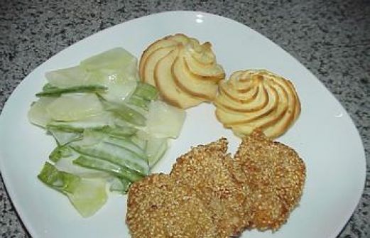 Zutaten für Personen Bild einstellen Salz, Pfeffer 1 großer Kohlrabi frisch 100 gr. Zuckerschoten 2 EL Sesam 2 EL Paniermehl 250 gr. Hähnchenfilets 1 EL Öl 50 ml Milch 1 EL heller Soßenbinder 2 TL Zitronen [...]