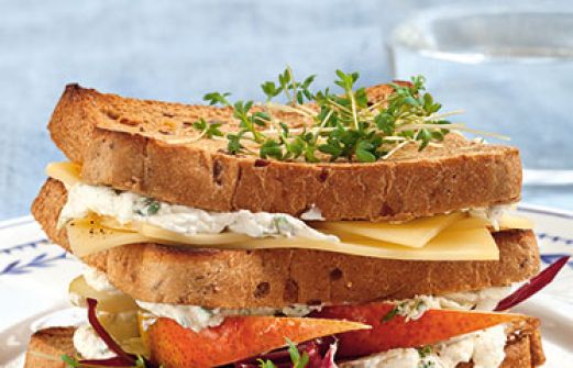 Käsesandwich mit Birnen Zutaten 1 kleiner Kopf Radicchio 1 feste Birne 1 EL Zitronensaft 1 Kästchen Kresse 75 g leichter Frischkäse (12 %) Salz Pfeffer 6 Scheiben Vollkorntoastbrot 4 kleine Scheiben Emmentaler oder Bergkäse (75 g) 1 kleiner Kopf Radicchio , 1 [...]