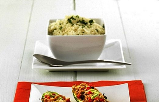 für 4 Personen 4 Zuccini 320 g Putenhackfleisch 2 weiße Zwiebeln 1/2 Bund glatte Petersilie 1 gelbe Paprika 1 rote Paprika 1 Bund Frühlingslauch 100 g geriebener Emmentaler Zitronensaft 300 ml Hühnerbrühe Salz und Pfeffer Currypulver Rapsöl Zucchini waschen und der Länge nach halbi [...]