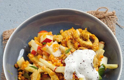 Linsensalat mit Currypute Zutaten 125 rote Linsen 1/4 l Gemüsebrühe 2 säuerliche Äpfel 300 g Putenbrustfilet 1 EL Öl Salz Pfeffer 1 EL Currypulver 2 Frühlingszwiebeln 150 g Joghurt (1,5 %) 125 rote Linsen , 1/4 l Gemüsebrühe , 2 säuerliche Äpfel , 300 [...]