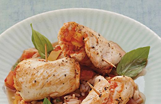 Involtini im Tomatenreis Zutaten 300 g Hähnchenbrustfilet Salz Pfeffer aus der Mühle 3 EL Ajvar (Paprikapaste) 1 gelbe Paprikaschote 1/2 Bund Basilikum 1 EL Olivenöl 100 g Parboiled Reis 400 ml Tomatensaft 2 Tomaten 6 kleine Holzspießchen 300 g Hähnchenbrustfilet [...]