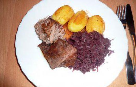 Zutaten für Personen Rezept mit Bild: Fl/Rind/Schwein: Sonntagsbraten Bild einstellen 800 g Rinderbraten 500 g Schweinenackenbraten 500 ml Rotwein trocken 3 Möhren 2 Stangen Staudensellerie 1 kl [...]