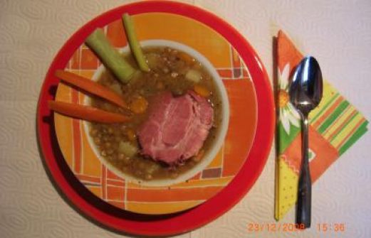 Zutaten für Personen Rezept mit Bild: Linseneintopf Bild einstellen 300 Gramm Linsen braun 300 Gramm Kasseler Kamm roh geräuchert 2 Lorbeerblatt Gewürz 1 Zwiebel frisch in würfeln 4 Karotten geschält in Sc [...]