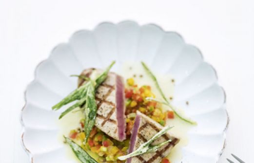 Gegrillter Thunfisch mit Gemüse Zutaten 2-3 EL Sojasauce 2 EL Sesamöl 4 EL Olivenöl 4 Thunfischsteaks (à ca. 125 g) Thunfisch 1 Eiweiß 50 g Mehl 50 g Speisestärke 200 ml eiskaltes Bier Salz je 1 rote, grüne und gelbe Paprikaschote 2 Schalotten 1 Knoblauchzehe 3 reife Str [...]