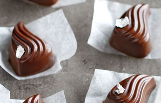 Nugattropfen mit Sesam Zutaten 300 g Zartbitterkuvertüre (60 %) 15 g helle Sesamsamen 250 g helles Mandelnugat (Spezialversand) etwas Blattsilber Pralinenform für 28 tropfenförmige Pralinen Einmalspritzbeutel Thermometer Winkelpalette Spachtel Papierspritzbeutel 300 g Z [...]