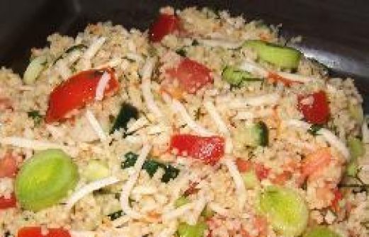 Portionen: 4 270 ml Wasser 1 EL Fischfond-Konzentrat 170 g Couscous 2 EL Olivenöl 50 ml Zitronensaft 1 Stange Lauch (nur der weiße Teil)