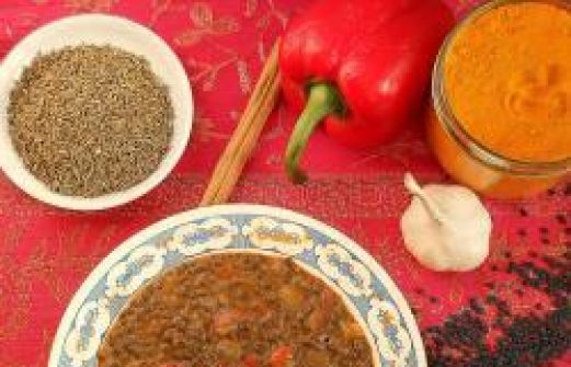 Portionen: 4 1 Zwiebel 1 rote Gemüsepaprika 1 Knoblauchzehe 1 EL Öl (Kokos, Erdnuss) 1,5 TL Zimt 1/2 TL gemahlener Kreuzkümmel 1 TL gemahlener Koriander