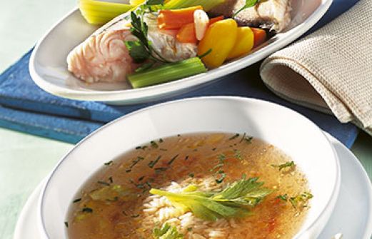 Fischsuppe in zwei Gängen Zutaten 1 kg Kochfisch (z. B. Rotbarsch, Kabeljau, Schellfisch; küchenfertig, ohne Kopf) Salz 4 EL Zitronensaft 500 g kleine fest kochende Kartoffeln 4 Möhren 4 Stangen Staudensellerie 2 Zwiebeln 2 Knoblauchzehen 4 kleine Tomaten 3 EL Olivenöl 12 [...]