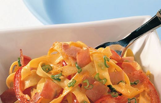 Schinkennudeln Zutaten 300 g Bandnudeln Salz 1 rote Paprikaschote 4 Frühlingszwiebeln 200 g gekochter Schinken in Scheiben 2 EL Butter 2 Eier 150 g Sahne Pfeffer 300 g Bandnudeln , Salz , 1 rote Paprikaschote , 4 Frühlingszwiebeln , 200 g g [...]