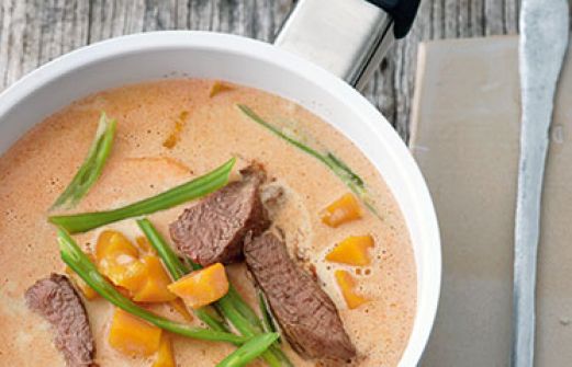 Lammfilets mit Kürbis-Kokos-Suppe Zutaten 150 g grüne Bohnen Salz 300 g Muskatkürbis 1 Stängel Zitronengras (Asienladen) 4 Kaffirlimettenblätter (Asienladen) 6 kleine, dünne Scheiben Ingwer 1 EL brauner Zucker 1 TL rote Thai-Currypaste (Asienladen) 1 TL Tomatenmark 1 Dose unge [...]