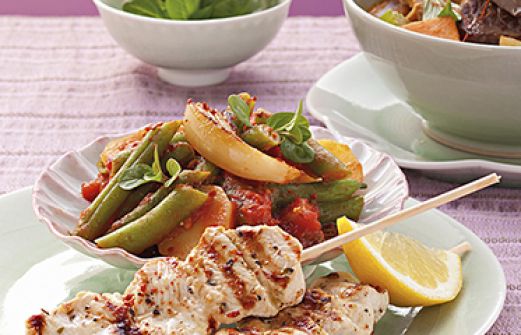 Puten-Souvlaki auf Bohnen-Kartoffel-Gemüse Zutaten 2 dicke Putenschnitzel (à 125 g) 3 TL Olivenöl 1 TL Zitronensaft 150 ml klare Gemüsebrühe 1/4 l getrockneter Oregano Salz Chilipulver 1/2 kleine Knoblauchzehe (nach Belieben) 300 g festkochende Kartoffeln 1 kleine Zwiebel [...]