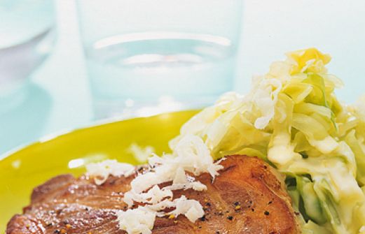 Schweinekoteletts mit Meerrettichkraut Zutaten 1/2 kleinerer Weiß- oder Spitzkohl (etwa 500 g) Salz 4 Schweinenackenkoteletts (je etwa 250 g) oder -steaks (je etwa 180 g) Pfeffer 1 EL scharfer Senf 2 EL Öl 1 Stück frischer Meerrettich (etwa 2 cm) 1/2 EL Butter 125 g saure Sah [...]