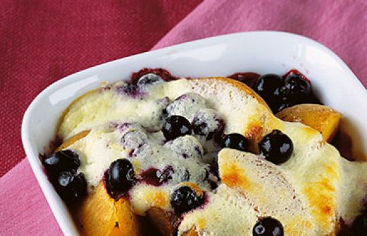 Aprikosen-Johannisbeer-Gratin Zutaten 400 g reife Aprikosen 150 g schwarze Johannisbeeren 1 EL Vanillezucker 1 Ei (Größe M) 50 g Puderzucker 250 g Sahnequark abgeriebene Schale von 1/2 unbehandelten Zitrone 1 EL Speisestärke 2 EL Mandelblättchen nach Belieben 400 g re [...]