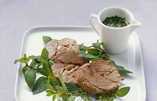 Lamm mit Minzsauce Zutaten 1 Lammkeule ohne Knochen (ca. 1,5 kg, vom Metzger auslösen lassen) Salz 1 Möhre 1 Stück Sellerieknolle 1 kleine Stange Lauch 1 Flasche trockener Weißwein (750 ml, ersatzweise Brühe) 1 Lorbeerblatt 1 EL schwarze Pfefferkörner 2 Bund frische Minze 1 [...]