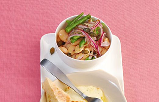 Bohnensalat mit Halloumi Zutaten Salz 400 g grüne Bohnen (oder gelbe Wachsbohnen) 2 Zweige Bohnenkraut 1 Dose weiße Riesenbohnen (250 g Abtropfgewicht) 1 rote Zwiebel 40 g Kürbiskerne 4 EL Rotweinessig Pfeffer 5 EL Olivenöl 1 EL Kürbiskernöl 250 g Halloumi-Käse (Käse au [...]