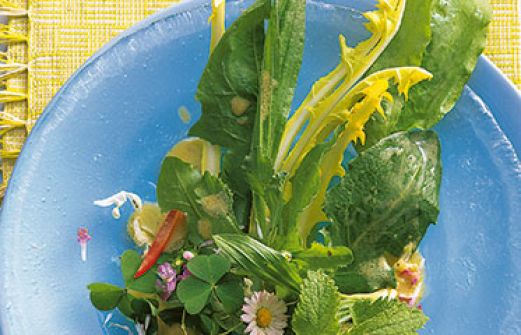 Wildkräutersalat mit Tomaten-Bärlauch-Dressing Zutaten 300 g gemischte Wildkräuter (Löwenzahn, Gänseblümchenblätter und -blüten, Spitzwegerich, Taubnessel, Sauerklee, Sauerampfer, zarte Blättchen vom Wiesenschaumkraut) 2 große reife Tomaten 4 EL Zitronensaft 1 TL scharfer Senf Salz [...]