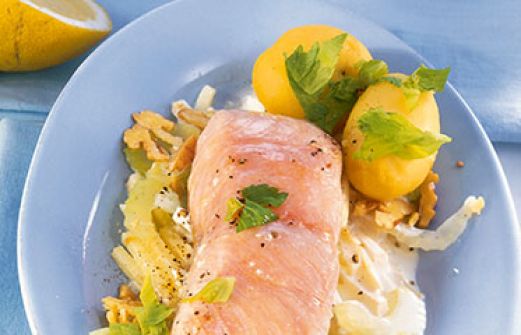 Lachs auf Waldorf-Gemüse Zutaten 4 Lachsfilets ohne Haut à ca. 80 g Salz 2 TL Halbfettbutter 150 g Knollensellerie 3 EL Zitronensaft 2 Stangen Bleichsellerie 400 g kleine Kartoffeln 1 EL Walnusskerne 2 EL Schmand 1 kleiner Apfel (möglichst rotschalig) Pfeffer Frischhal [...]