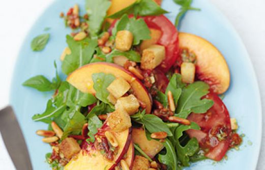 Sommersalat mit Knoblauchcroûtons Zutaten 750 g Tomaten (am besten Fleischtomaten) 2 reife, feste Pfirsiche 2 Bund Rucola 5 Stängel Basilikum 1 rote Chilischote 4 in Öl eingelegte getrocknete Tomaten 8 Zweige (Zitronen-)Thymian 1 Knoblauchzehe 1 EL Honig 1 TL Dijon-Senf [...]
