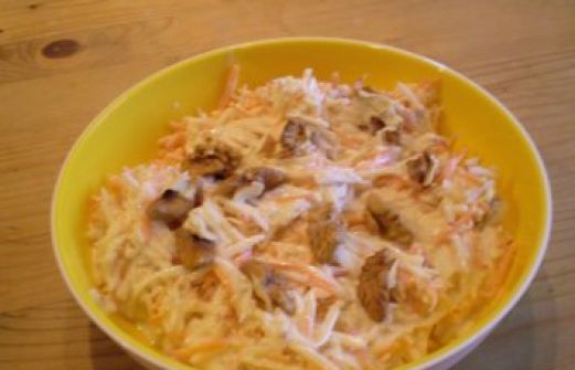 Zutaten für Personen Bild einstellen 1 mittelgroße Sellerieknolle 1 rotschalige Äpfel 1 mittelgroße Karotten 50 g Walnusskerne 0.5 Becher Creme Double Saft von 1 Zitrone etwas Essig Salz, Zucker 1 EL Worcest [...]